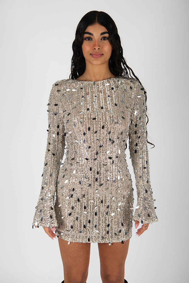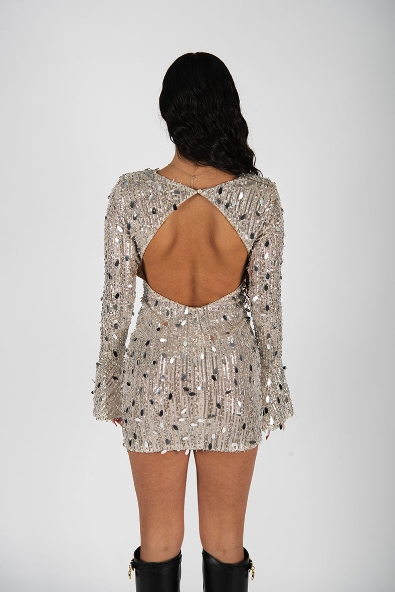 Mini abito in full paillettes.Polso a campanella.Oblò nudo sulla schiena .Fodera interna.