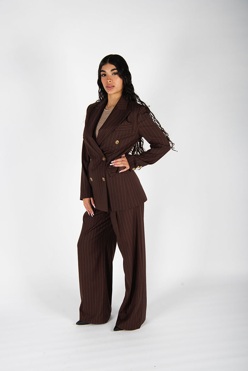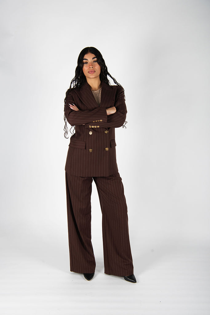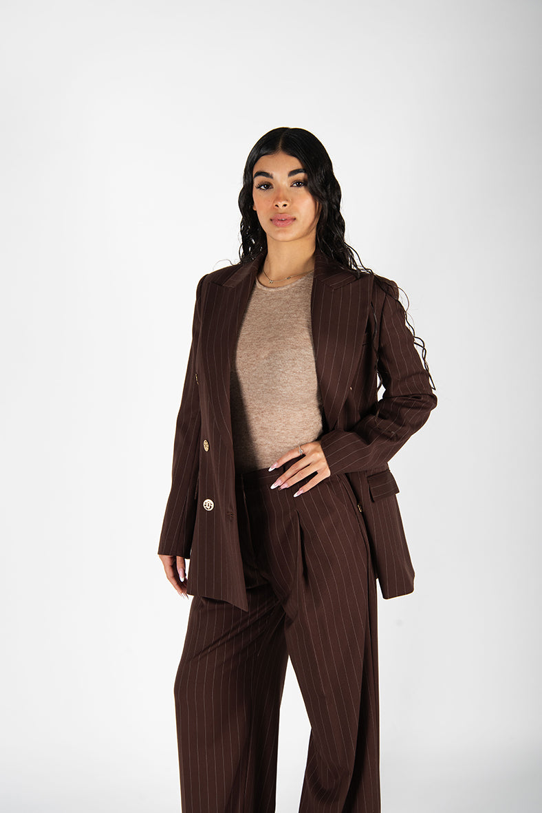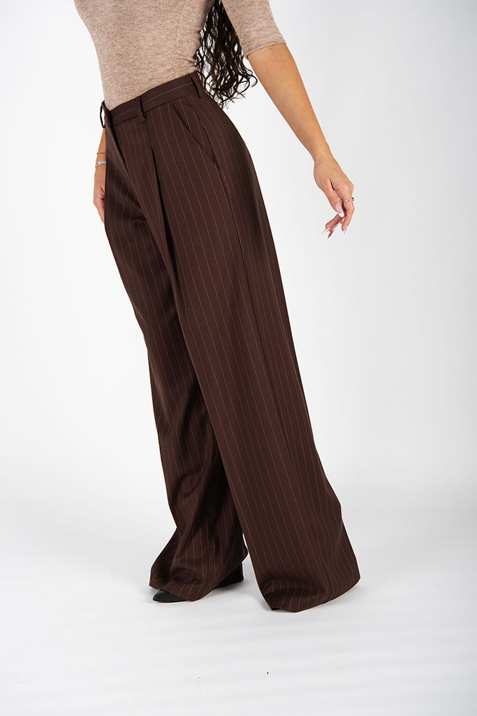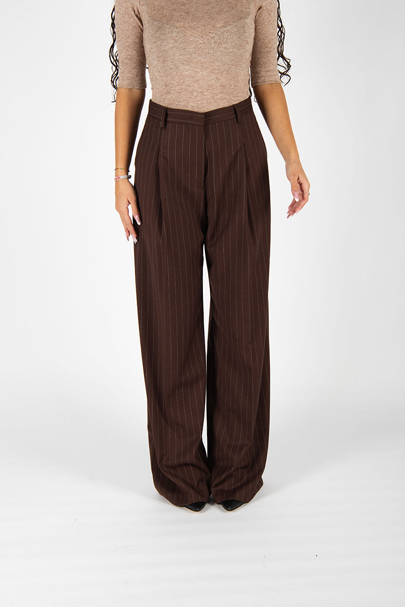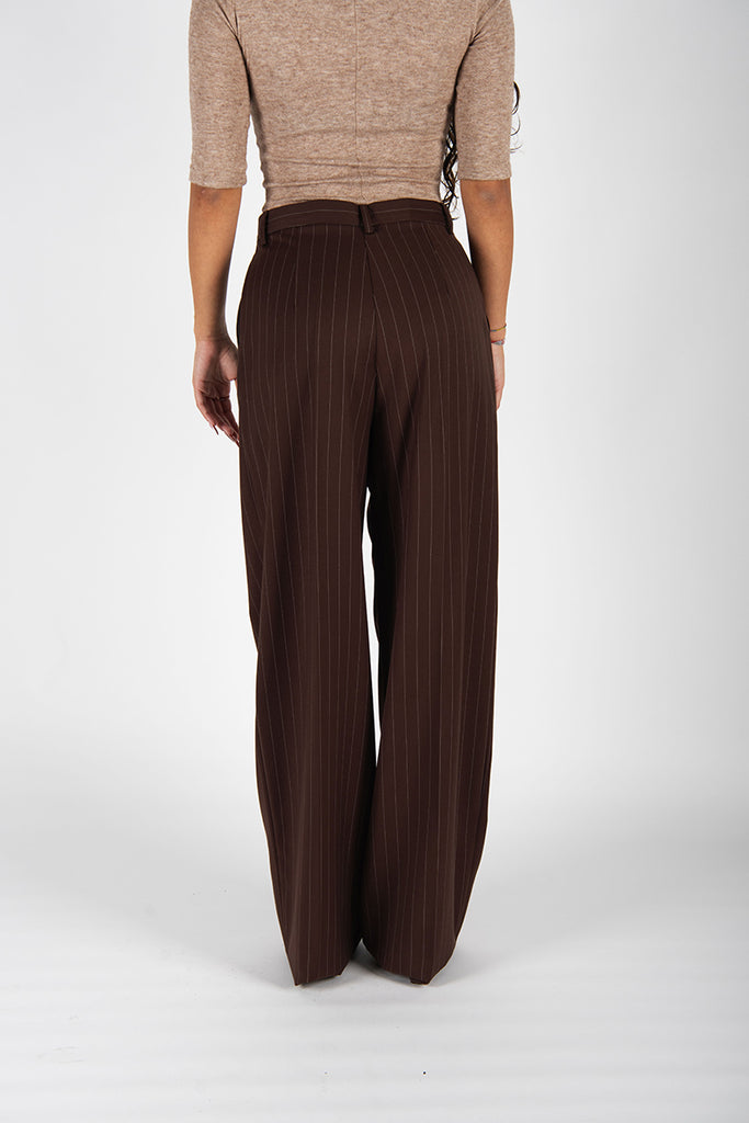 Pantalone gessato in tessuto crepe elasticizzato. Vita medio alta con passanti, pences sul davanti e tasche laterali.Gamba con vestibilità morbida.