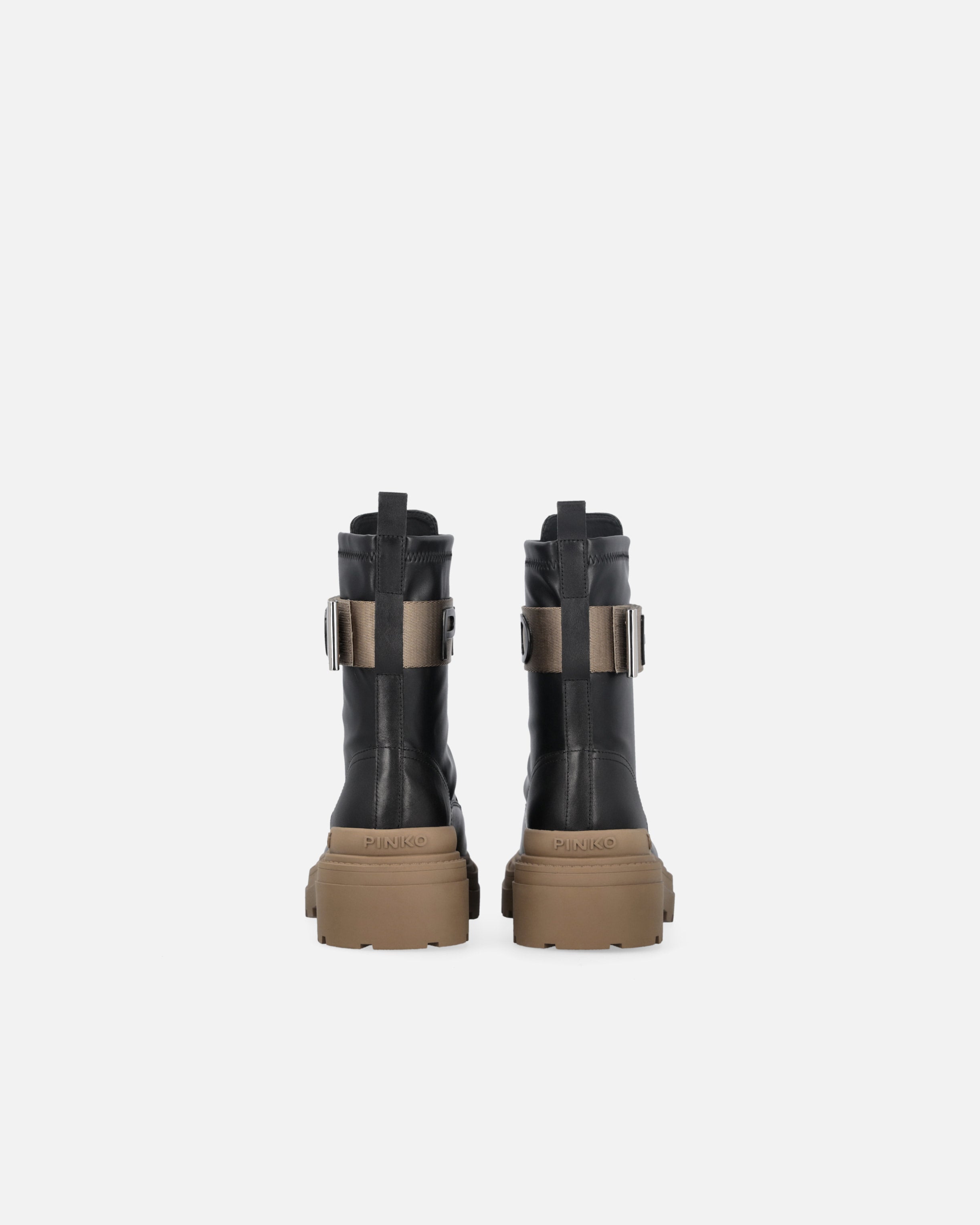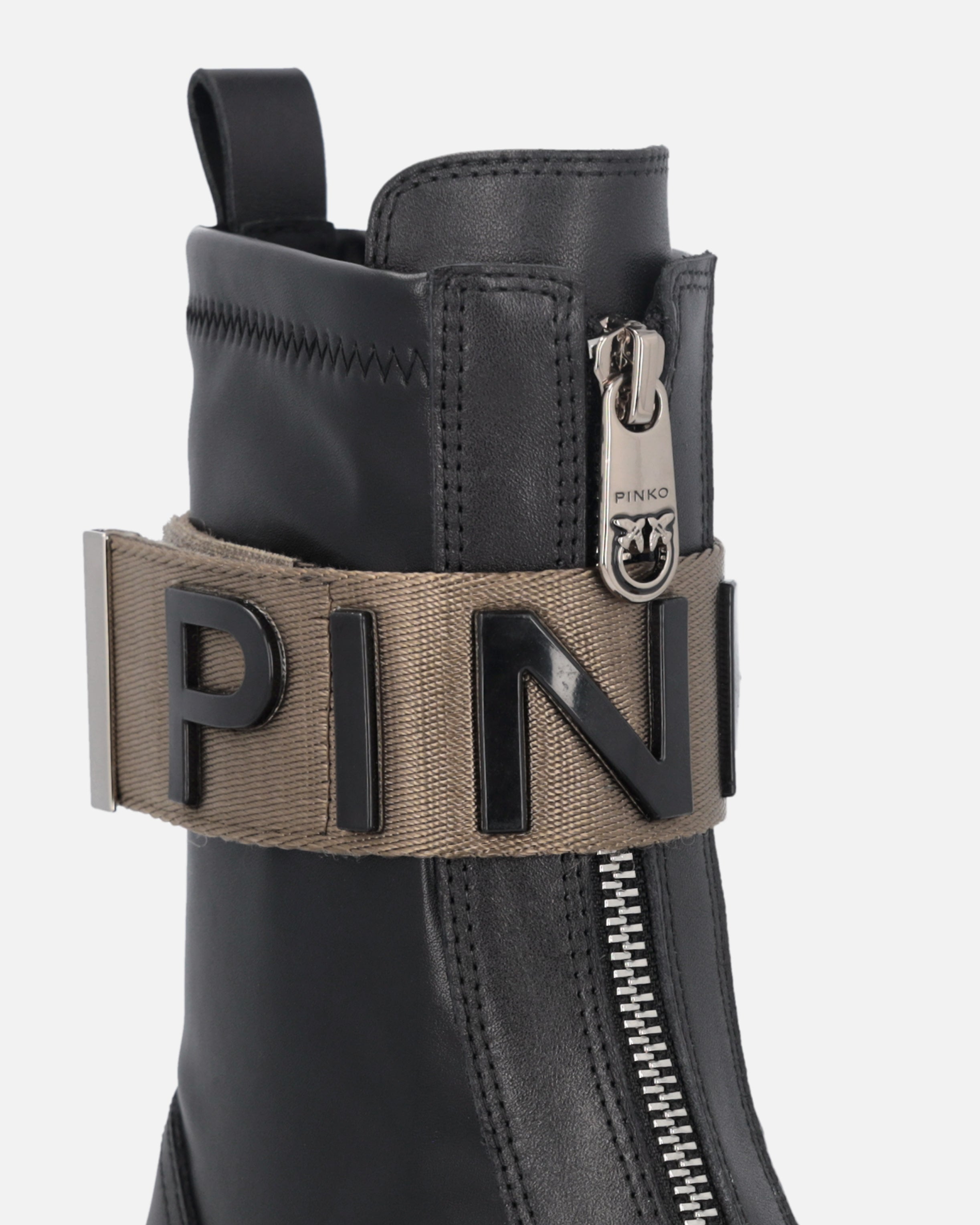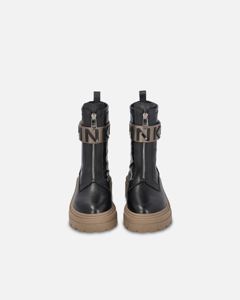 Stivali alla caviglia in pelle con suola carrarmato platform in gomma, fodera in pelle, chiusura con zip sul davanti e tirante posteriore per facilitare la calzata. Il tocco finale è dato dalla fascia in nastro tecnico con logo lettering PINKO. Moderni e versatili, questi anfibi sono perfetti per un look casual e grintoso. Altezza della suola platform: 5,5 cm.