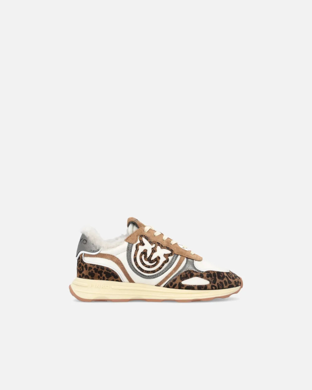 Scarpe sportive con lacci realizzate in pelle e pelle scamosciata con interno in tessuto Aspen effetto pelliccia. La tomaia, realizzata in un mix di vari materiali e colori a contrasto, è cosparsa di inserti che arricchiscono il modello con l'eleganza che da sempre contraddistingue il brand. Il logo lettering PINKO spicca sulla linguetta e sul tallone, mentre il logo Love Birds impreziosisce i lati delle sneakers. La suola alta 3,5 cm è caratterizzata da un fondo logato. Il dettaglio di punta è la stampa animalier, che rende queste scarpe perfette per ultimare un look casual ma audace.