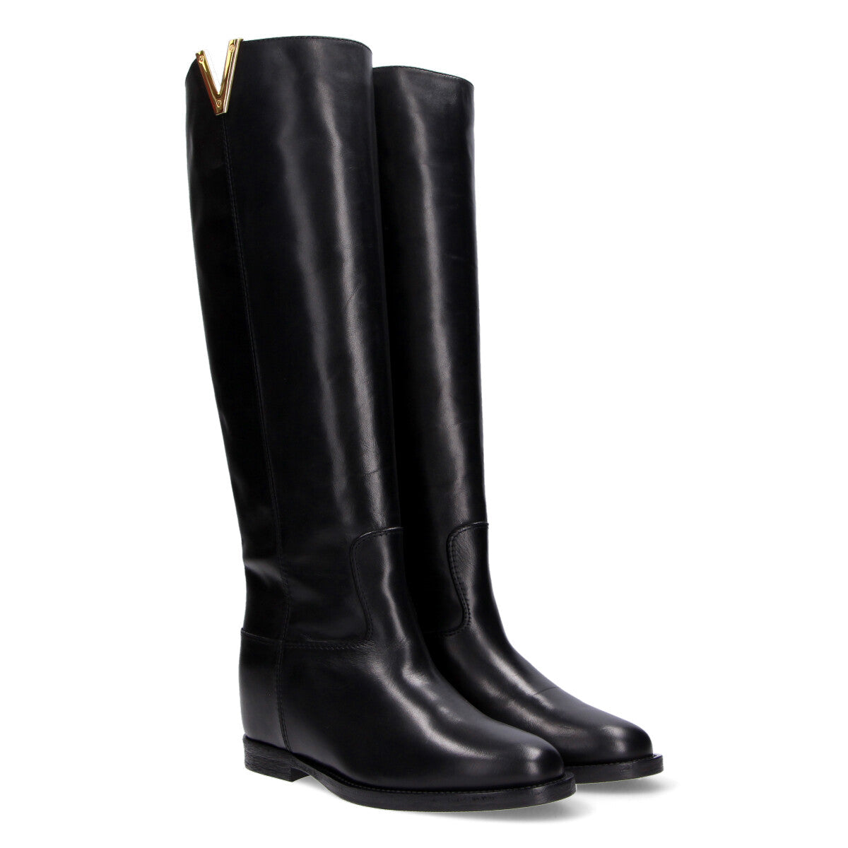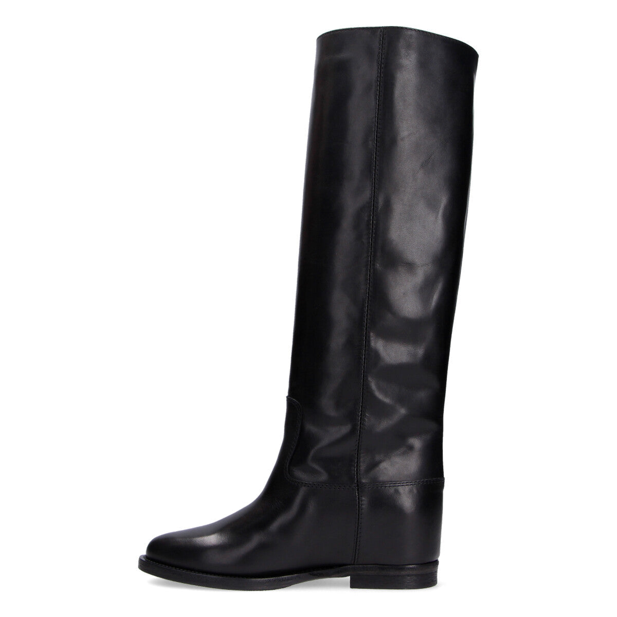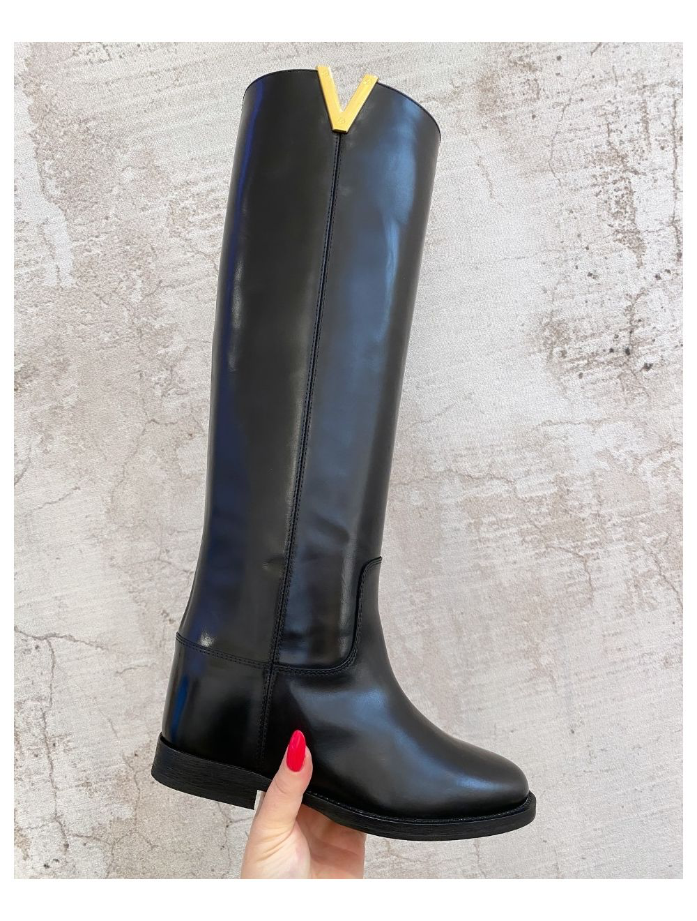 Stivale tubolare in pelle.Alzatacco interno di 5 cm circa.Sottopiede in pelle.Suola in cuoio.V oro.