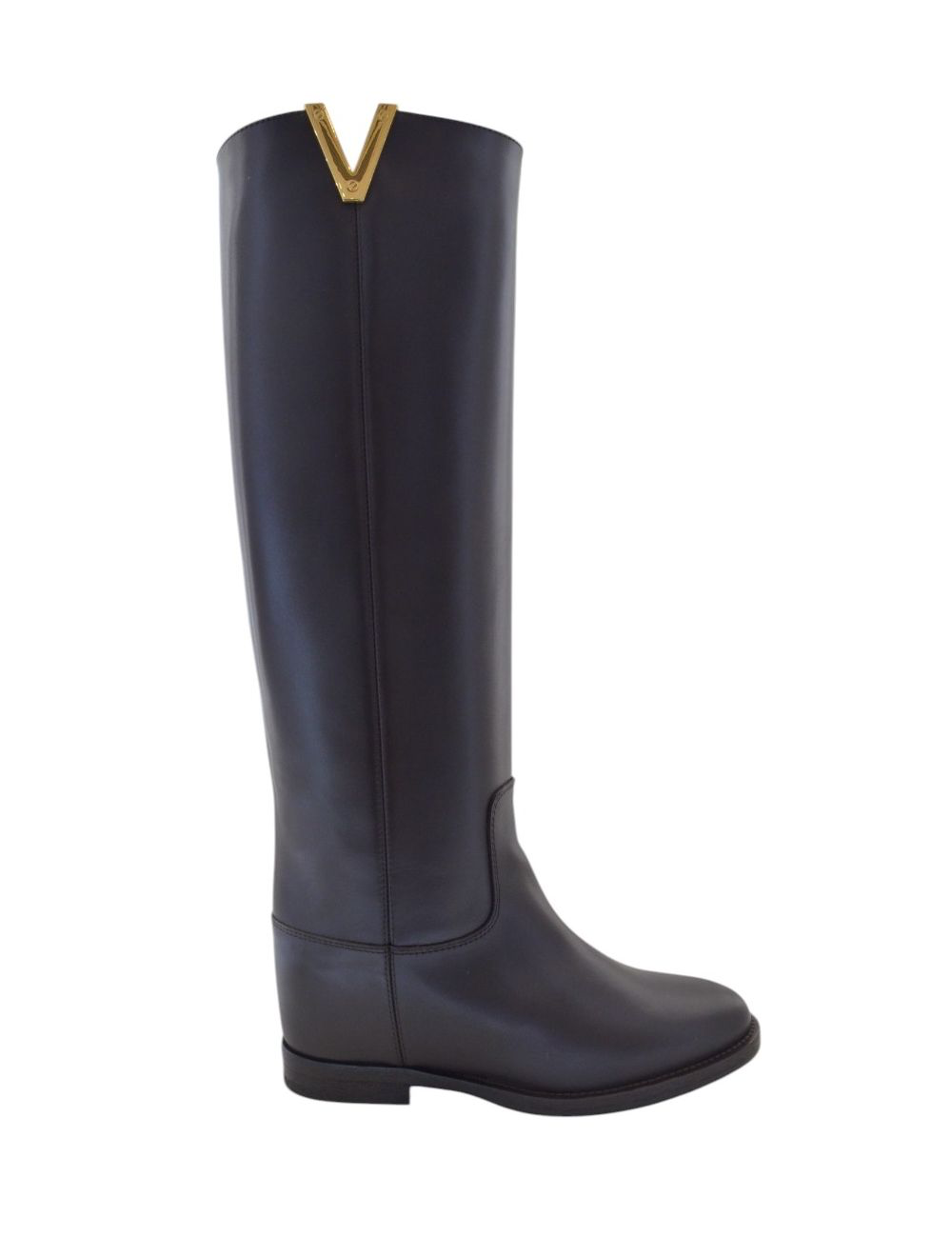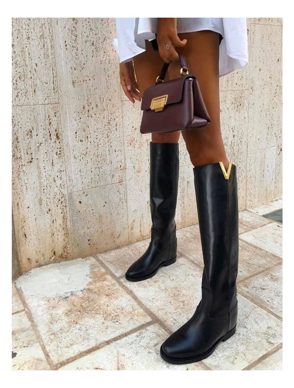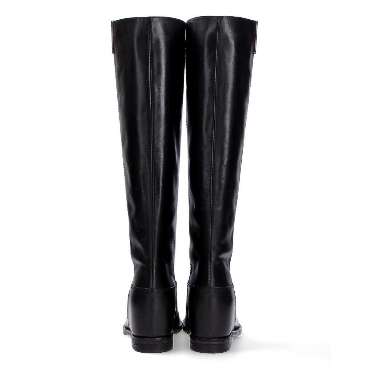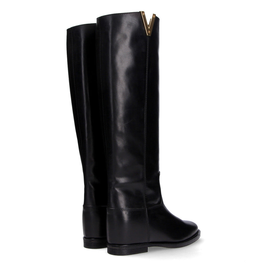 Stivale tubolare in pelle.Alzatacco interno di 5 cm circa.Sottopiede in pelle.Suola in cuoio.V oro.