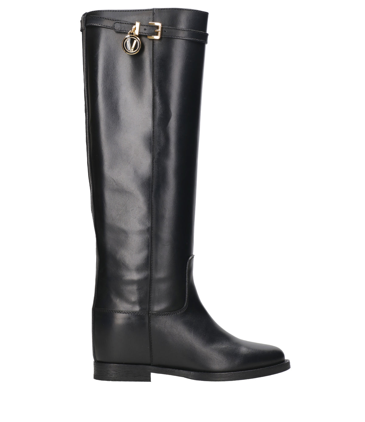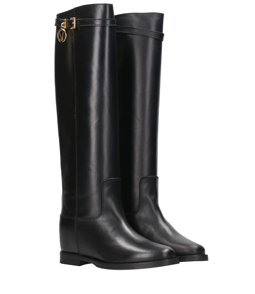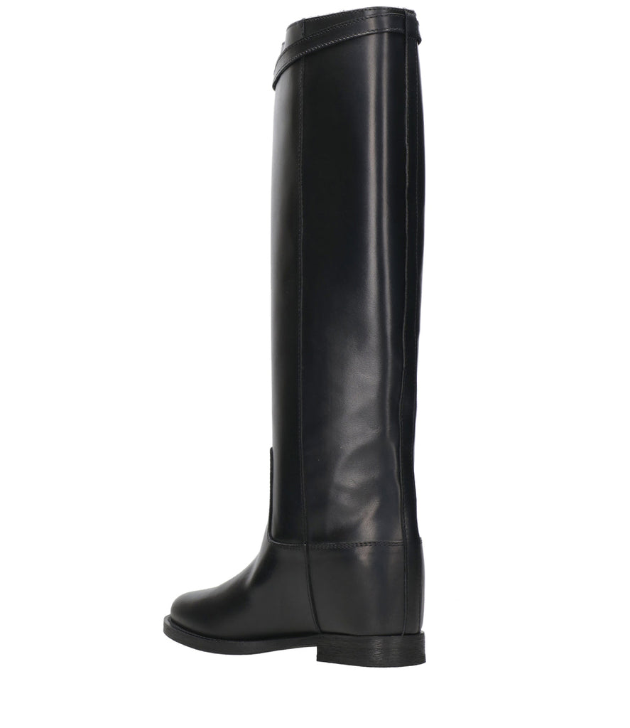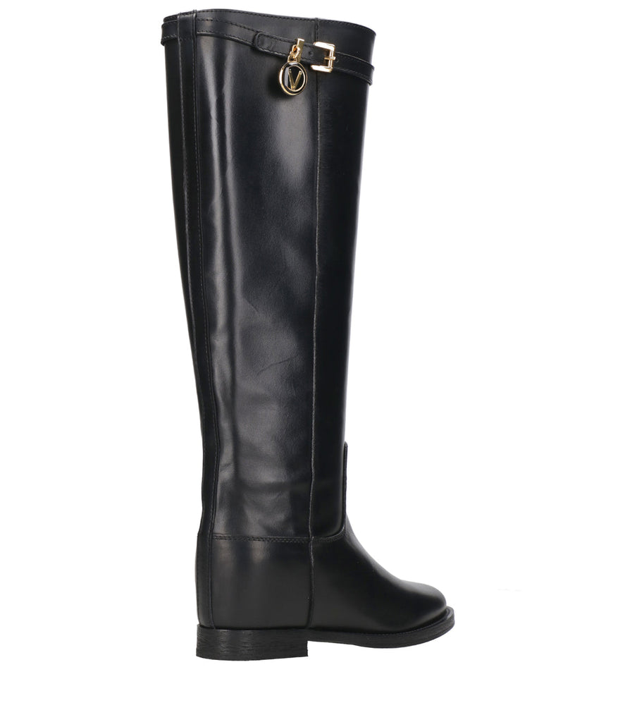 Stivale Via Roma 15 in pelle liscia, sul bordo cinturino con fibbia in metallo dorato e ciondolo dorato , zeppa interna, punta a mandorla, suola e tacco in cuoio e gomma antiscivolo.Sottopiede in pelle.Alzatacco interno di circa 7 cm.Gambale tubolare.
