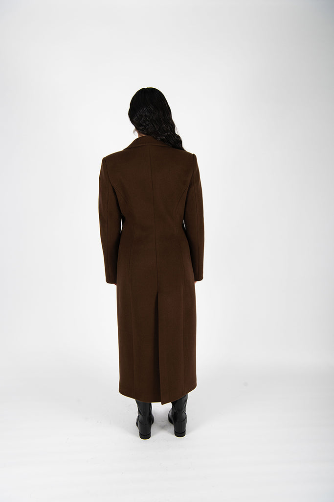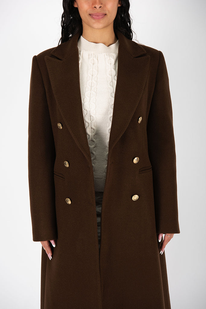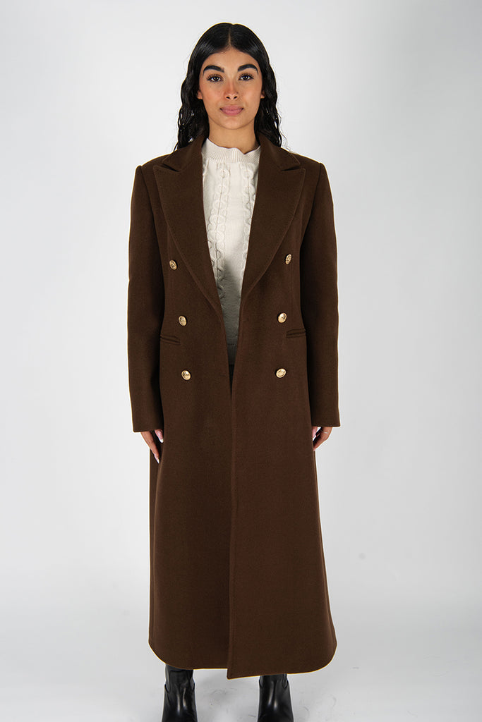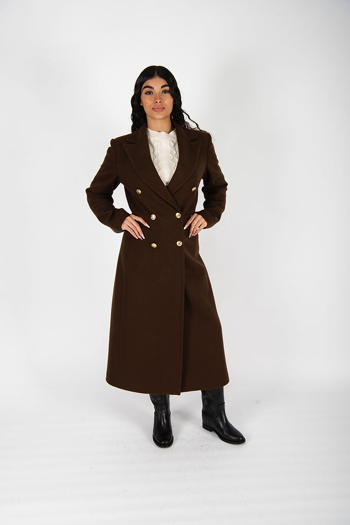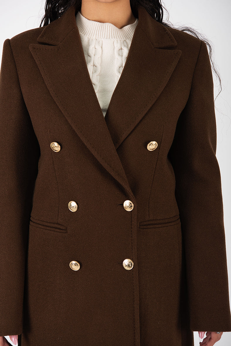Cappotto doppiopetto foderato con bottoni in galvanica oro.Lunghezza caviglia con vestibilità regular fit. Spalline leggermente imbottite.