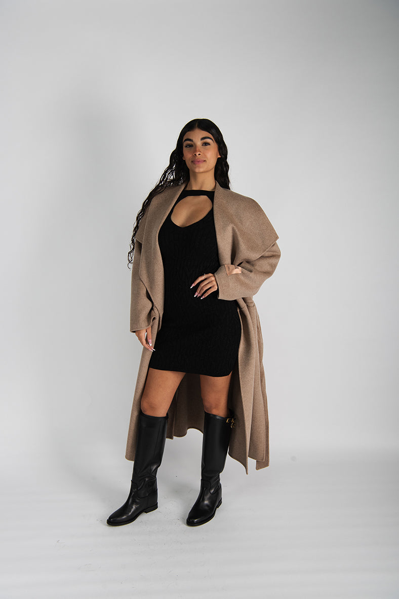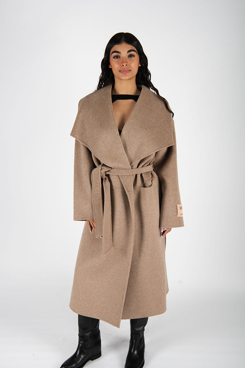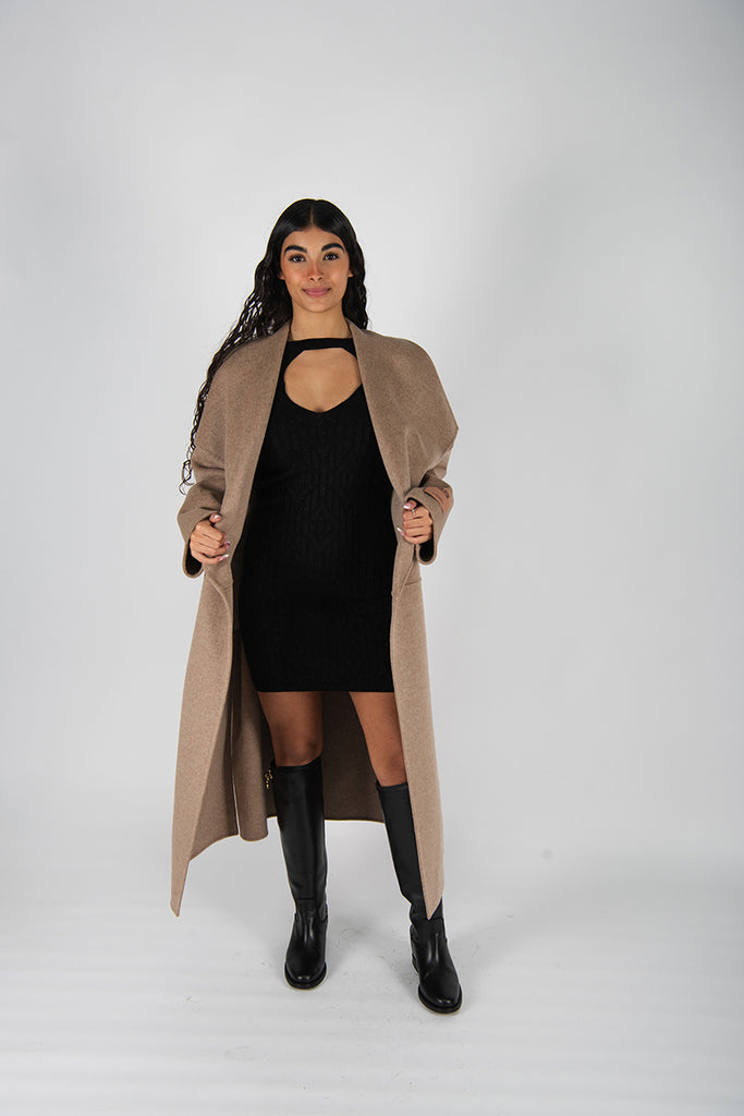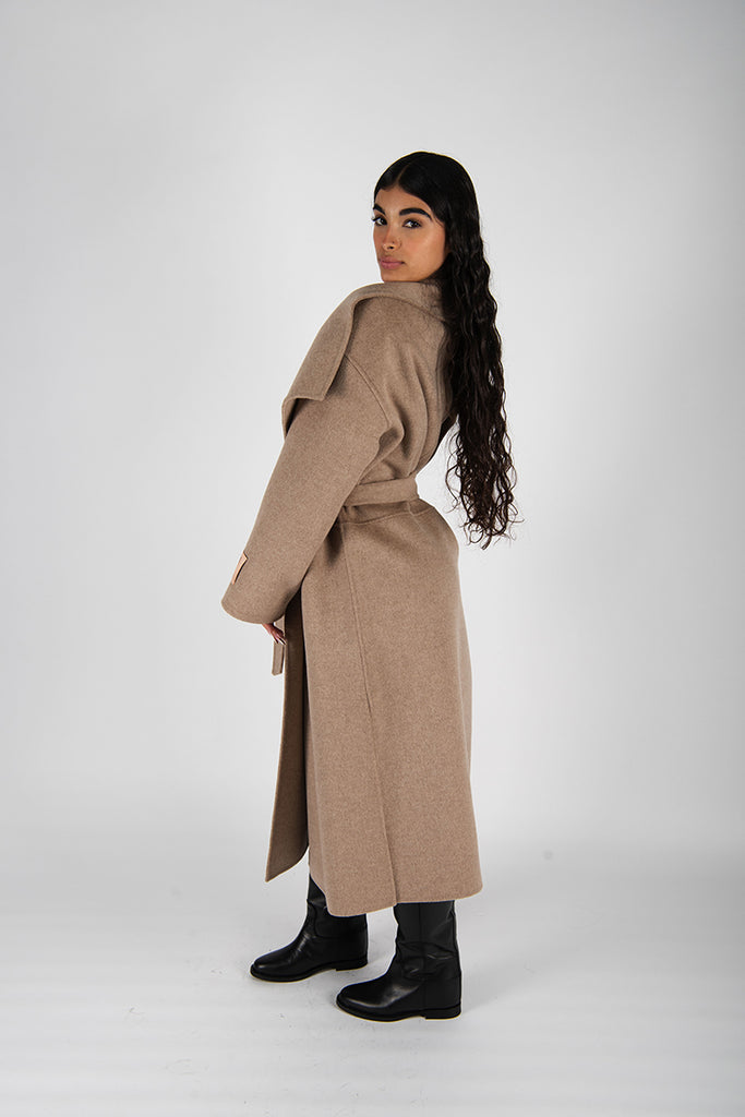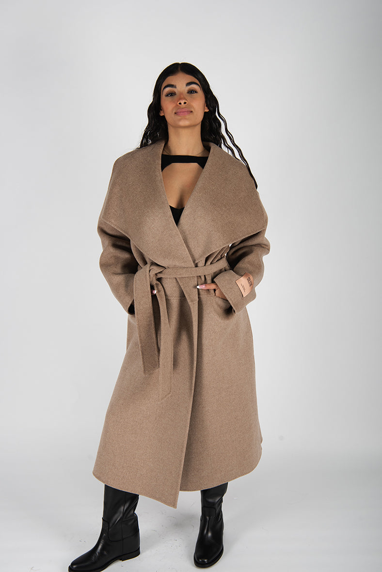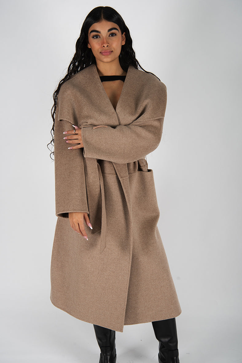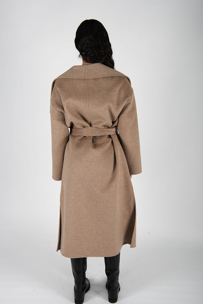 Cappotto a vestaglia in doppio panno di lana .Ampio collo a scialle. Vestibilità over.Tasche davanti. Spacchi laterali.