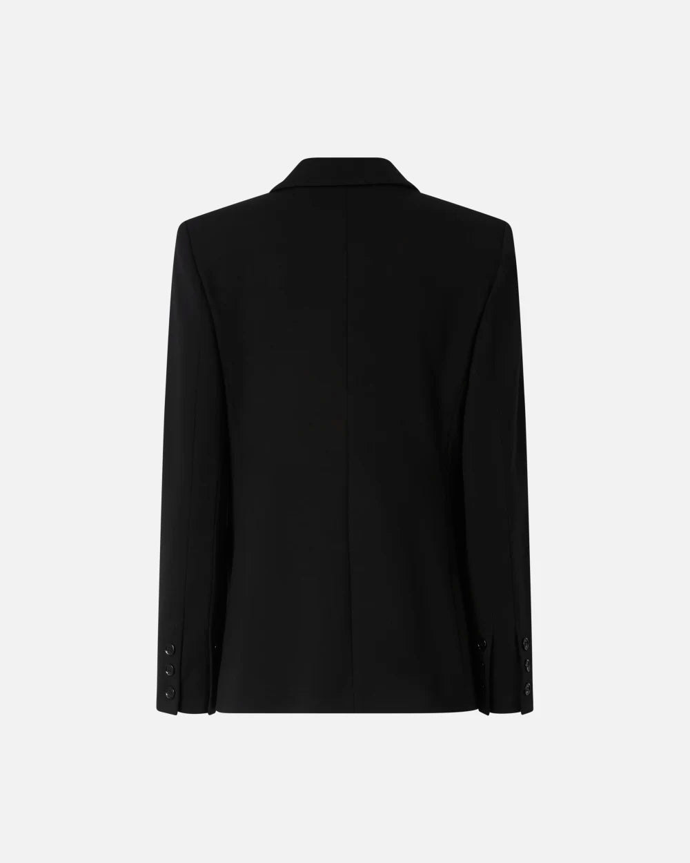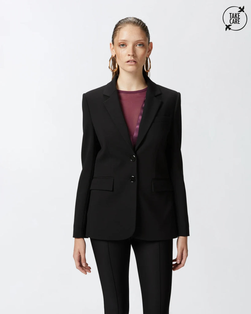 Giacca blazer monopetto realizzata in tessuto tecnico di viscosa stretch lavorata a punto stoffa. Linea leggermente boxy con collo a rever, maniche lunghe con spalle costruite, taschino a filetto e tasche con patta applicata sui fianchi. La giacca è foderata in tessuto e la chiusura monopetto è completata da doppio bottone in tono colore. Il tessuto principale è realizzato con il 67% di viscosa da foreste gestite responsabilmente.