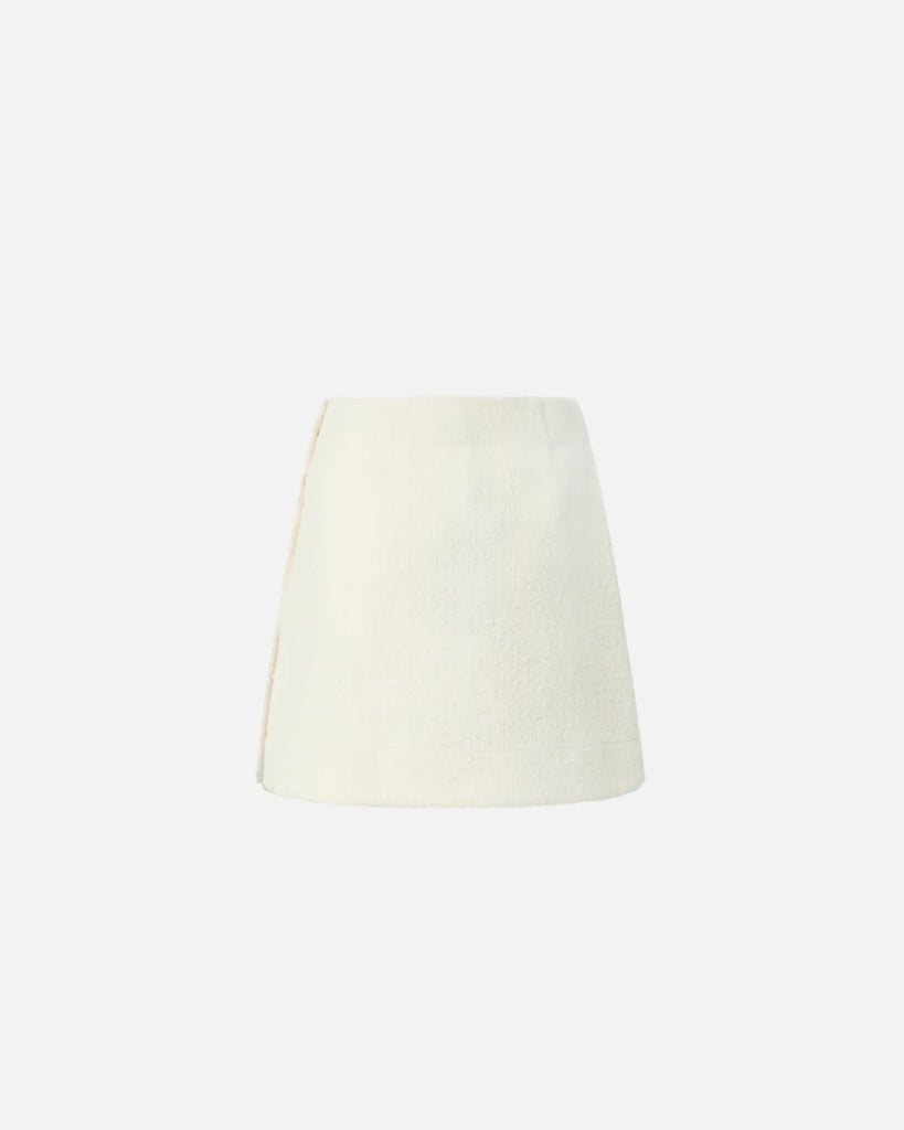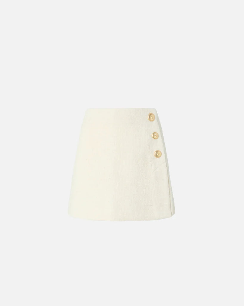 Minigonna con linea a trapezio realizzata in tessuto bouclé di misto cotone e lana. Il capo presenta un orlo dritto, pinces sul retro per migliorare la vestibilità e una chiusura a portafoglio impreziosita da tre bottoni in metallo decorati da stella. Perfetta abbinata alla giacca trucker nello stesso materiale o con un top aderente.