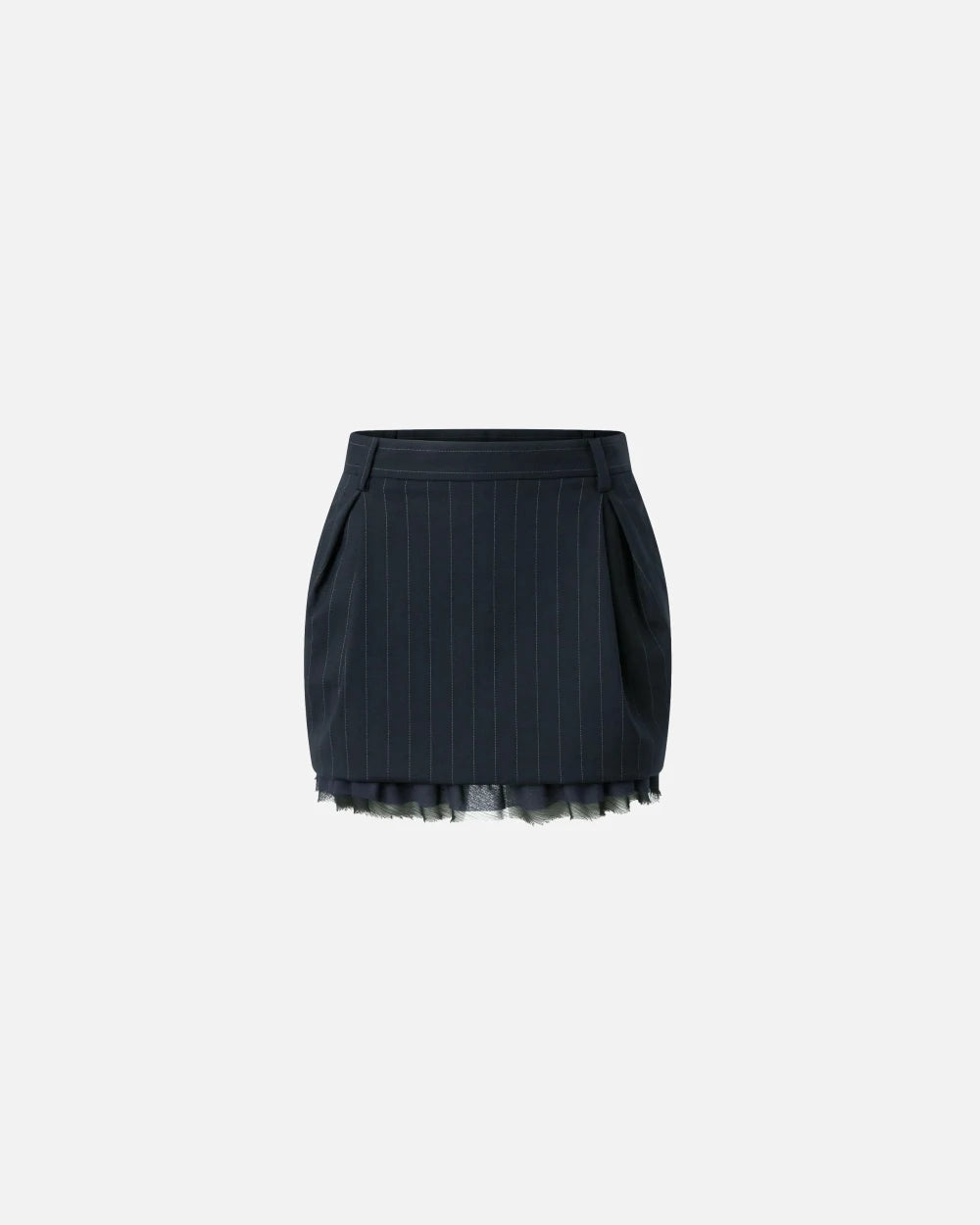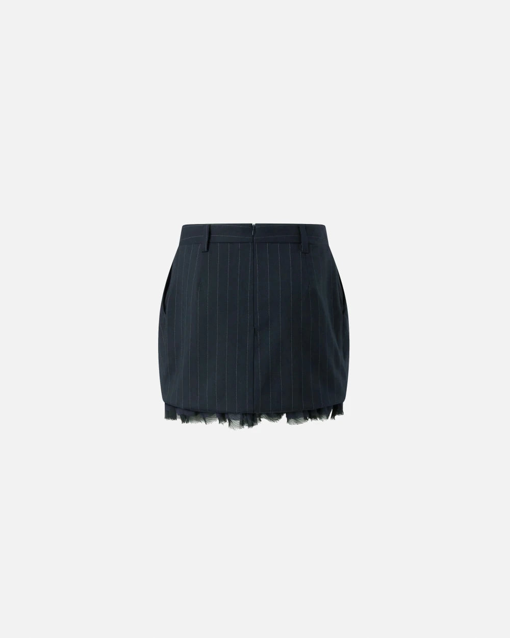 Gonna corta foderata dalla silhouette a palloncino, sottolineata da una costruzione a pieghe morbide. Il tessuto utilizzato è un classico gessato in lana poly caratterizzato da un cambio di tessitura e di luce a sottolineare il disegno del materiale. La vita è dotata di comodi passanti per cintura, mentre il fondo è tagliato a vivo per un effetto finale più leggero e vaporoso. Chiusura con zip invisibile sul retro. Abbina la minigonna con la giacca della stessa fantasia per un total look davvero originale e impossibile da dimenticare.