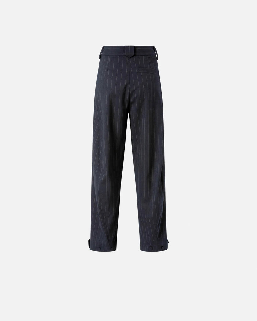 Pantaloni balloon-fit con gamba a palloncino morbida e arrotondata nella parte superiore e più stretta al fondo, dove si trova anche un cinturino per regolare l'indosso a seconda delle necessità. Il tessuto utilizzato è un classico gessato in lana poly caratterizzato da un cambio di tessitura e di luce a sottolineare il disegno del materiale. Il design sartoriale del capo è ulteriormente evidenziato dalle pinces, dalla costruzione della vita con passanti per cintura e dal taschino a filetto sul retro. Chiusura con bottone e zip nascosta. Abbina i pantaloni con il blazer nello stesso tessuto per un effetto tailleur, oppure indossa una camicia per un look formale, ma non troppo.