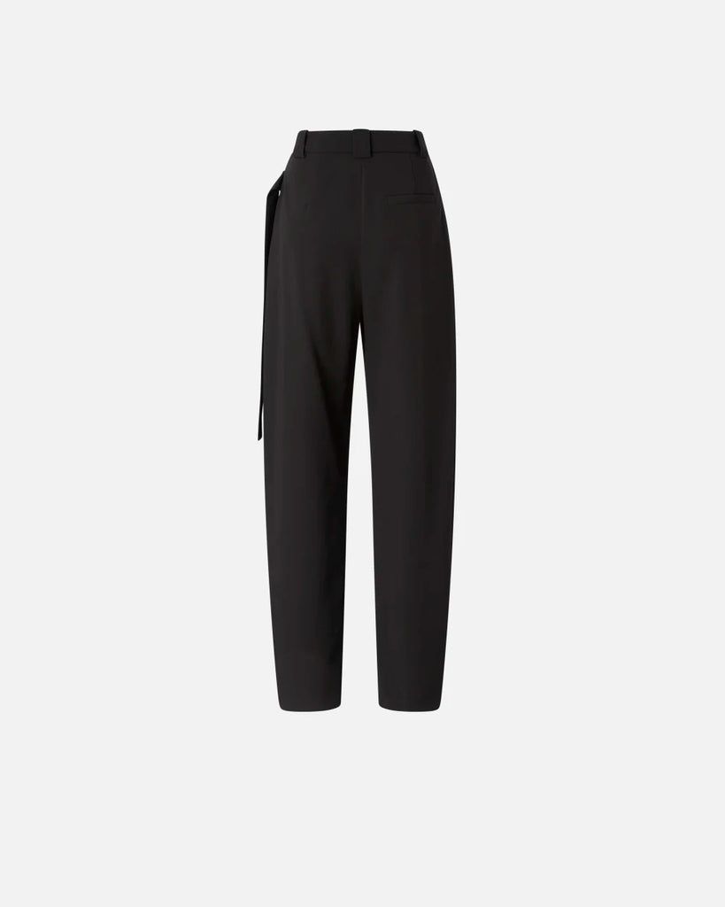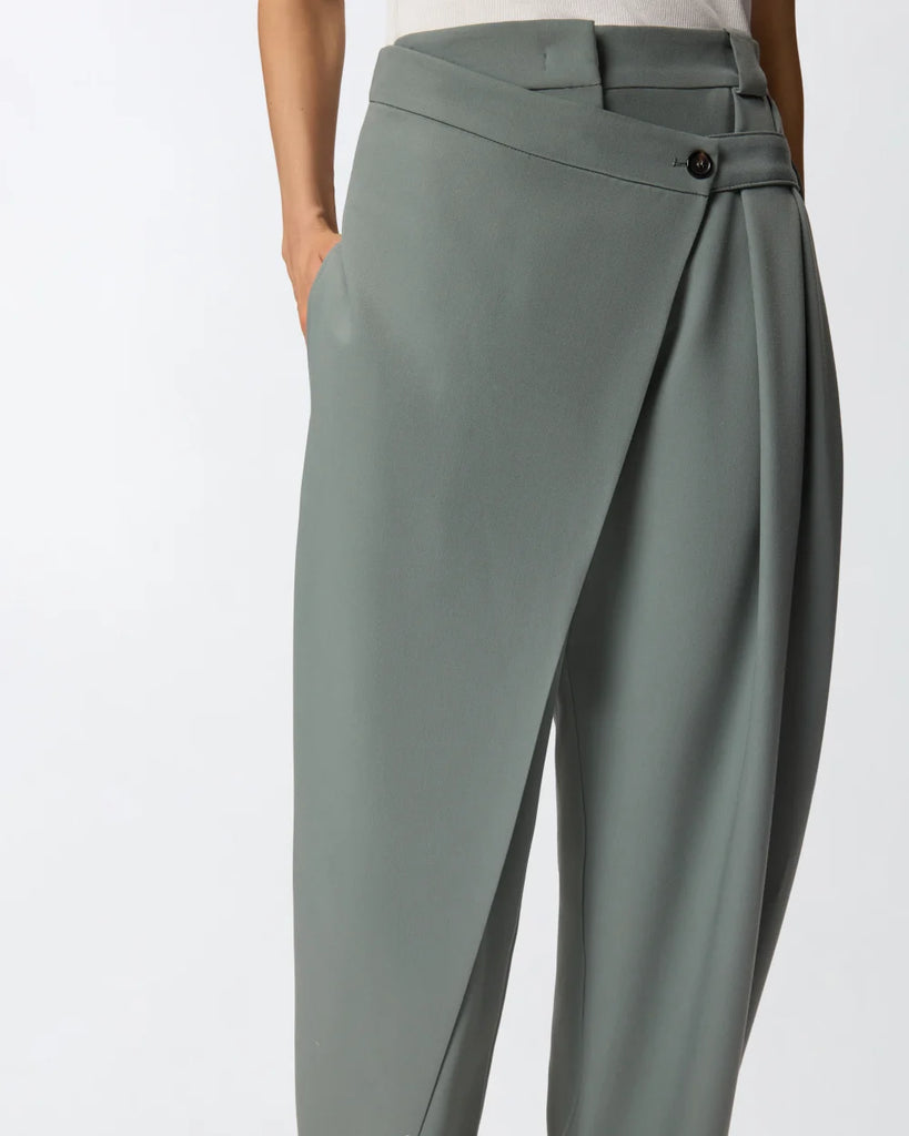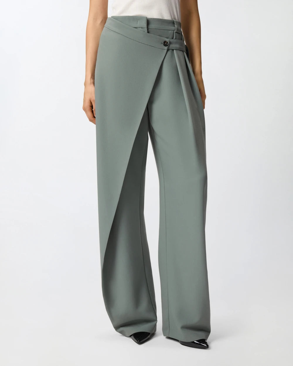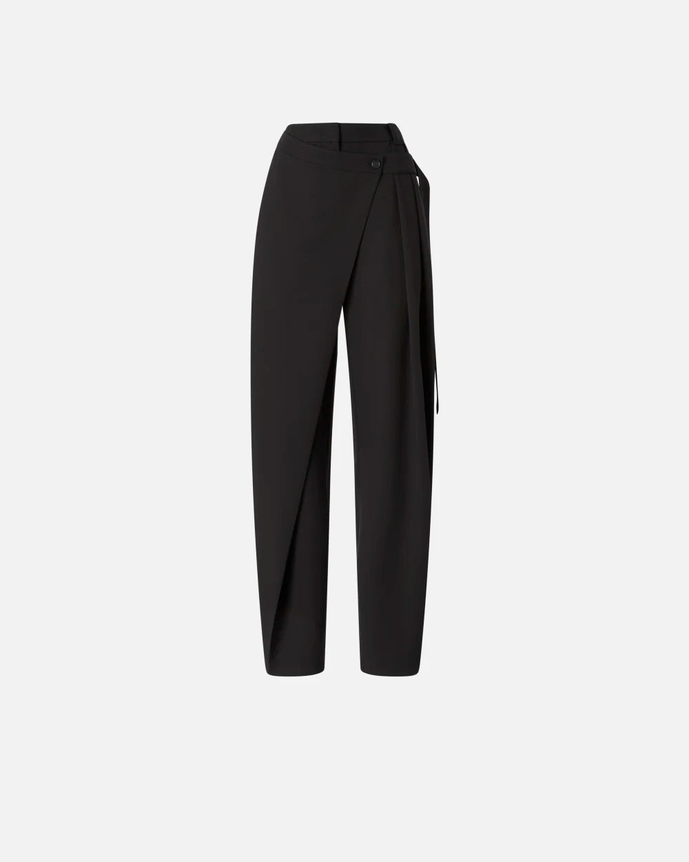 Pantaloni wide leg eleganti caratterizzati da una particolare costruzione frontale con panello stile portafoglio da chiudere su un fianco. Il capo è realizzato in un tessuto di viscosa stretch dalla mano particolarmente fluida. La fodera interna in tessuto garantisce il massimo comfort durante l'indosso. Completano il design i passanti per cintura, la chiusura frontale nascosta e il taschino a filetto sul retro. Abbina i pantaloni con il blazer nello stesso tessuto per un effetto tailleur, oppure indossa una camicia per un look formale, ma non troppo.