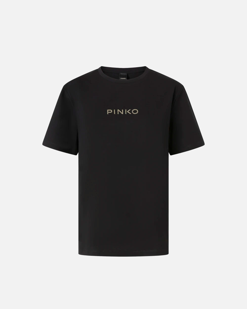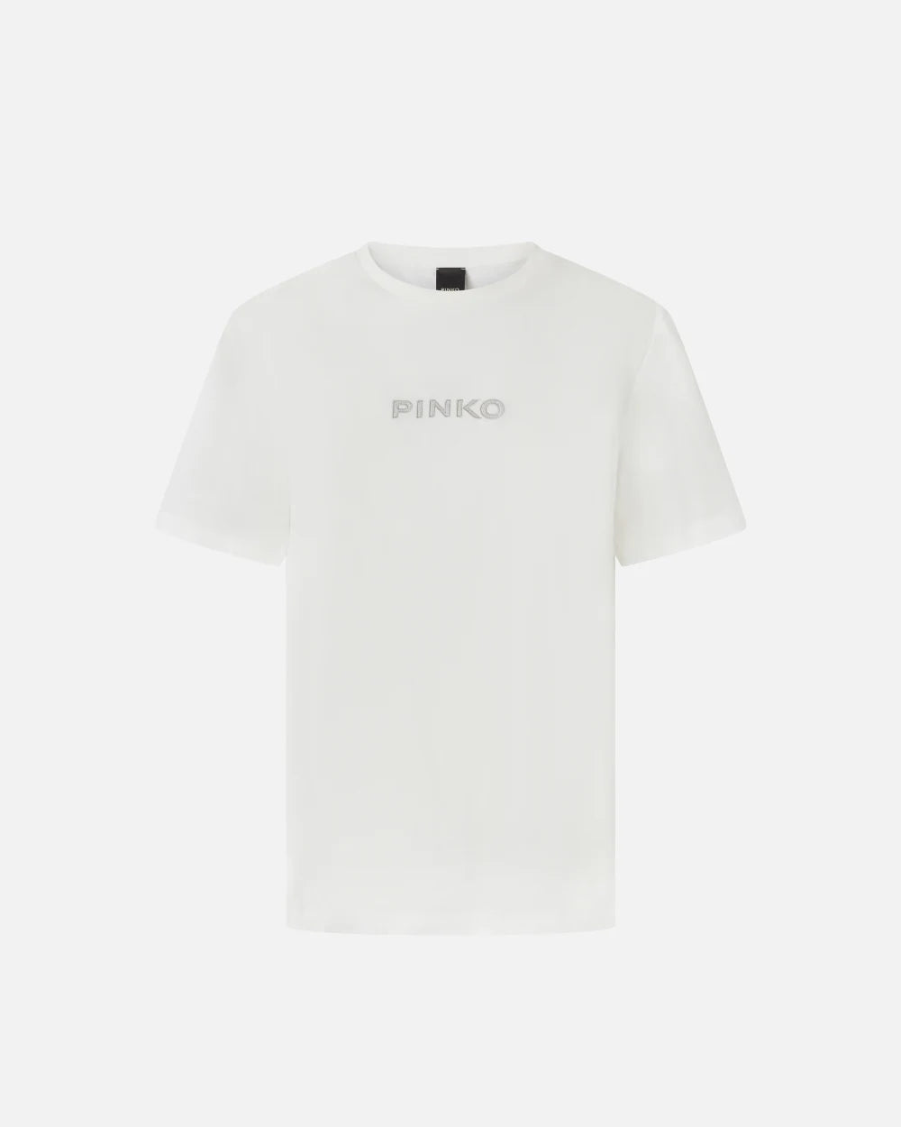 T-shirt in jersey di puro cotone con scollo tondo e maniche corte. Il modello è personalizzato con luminosi strass che ricoprono sia il logo lettering PINKO sul davanti, sia la scritta sul retro con il claim "See breezy, PINKO easy" e l'immancabile logo Love Birds. Questa t-shirt si abbina con facilità ai tuoi pantaloni preferiti, elevando il tuo look in modo semplice, elegante e originale.