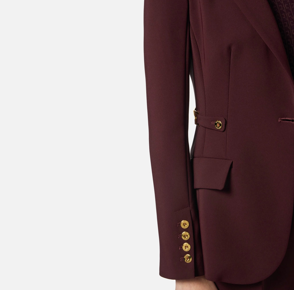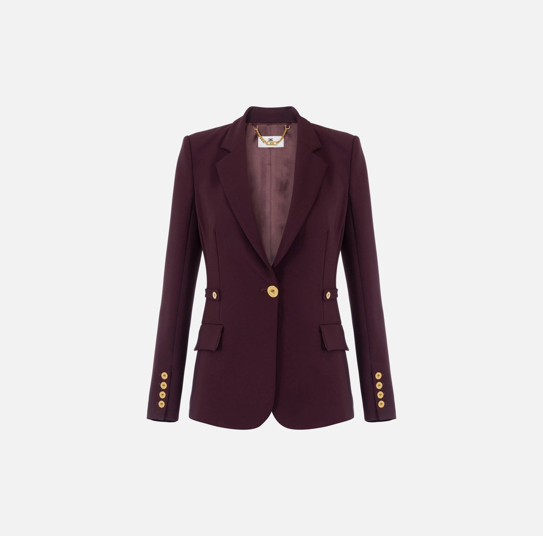 Giacca in crêpe leggero dalla vestibilità slim. Il blazer ha spalle strutturate, rever classico, patte applicate. I fianchi sono impreziositi dall'accessorio gioiello con logo, i bottoni in metallo dorato illuminano il capo.