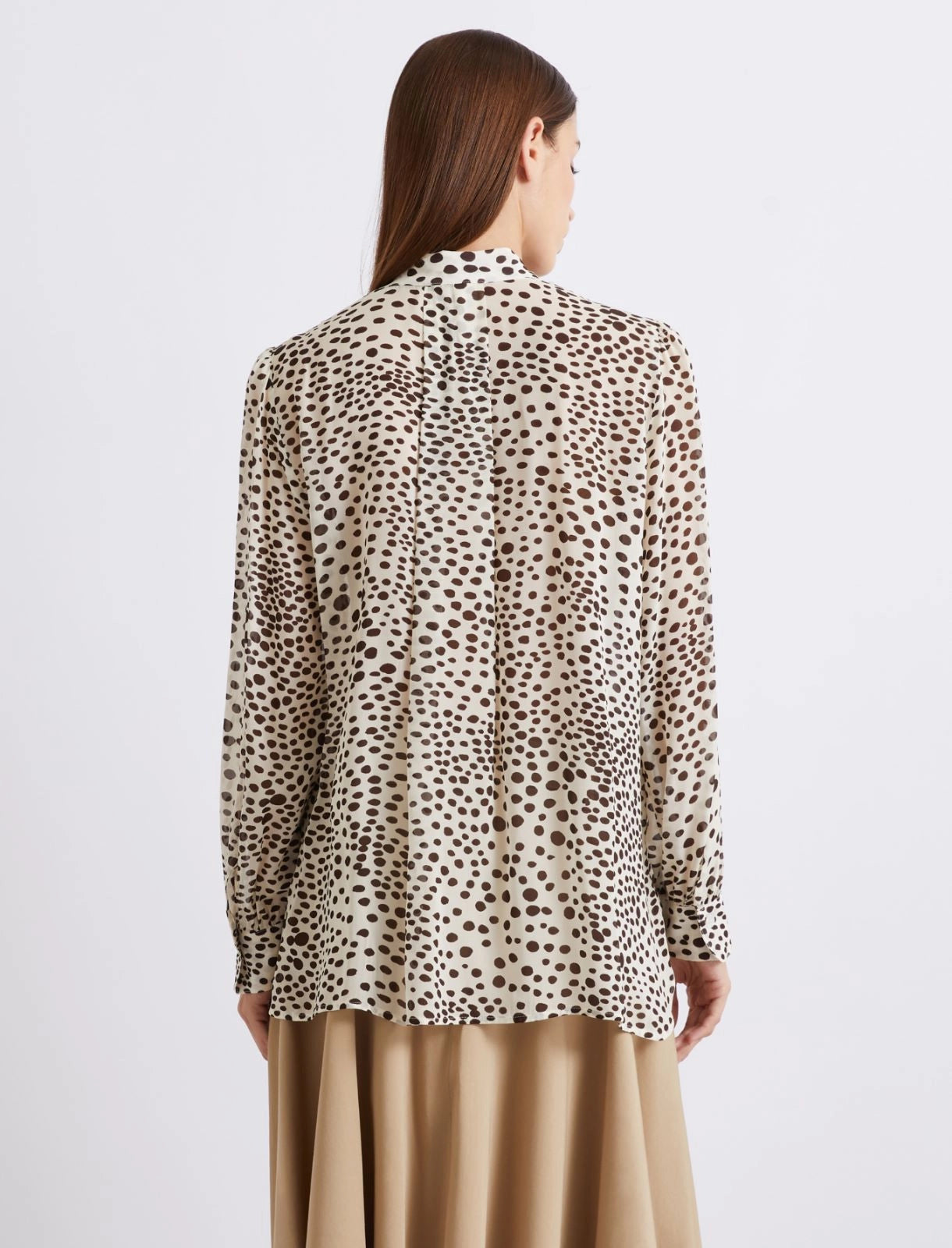 Morbide rouche dal cuore romantico decorano questa camicia in georgette. Da abbinare a gonne dai toni luminosi, sotto lo spolverino must have di primavera.