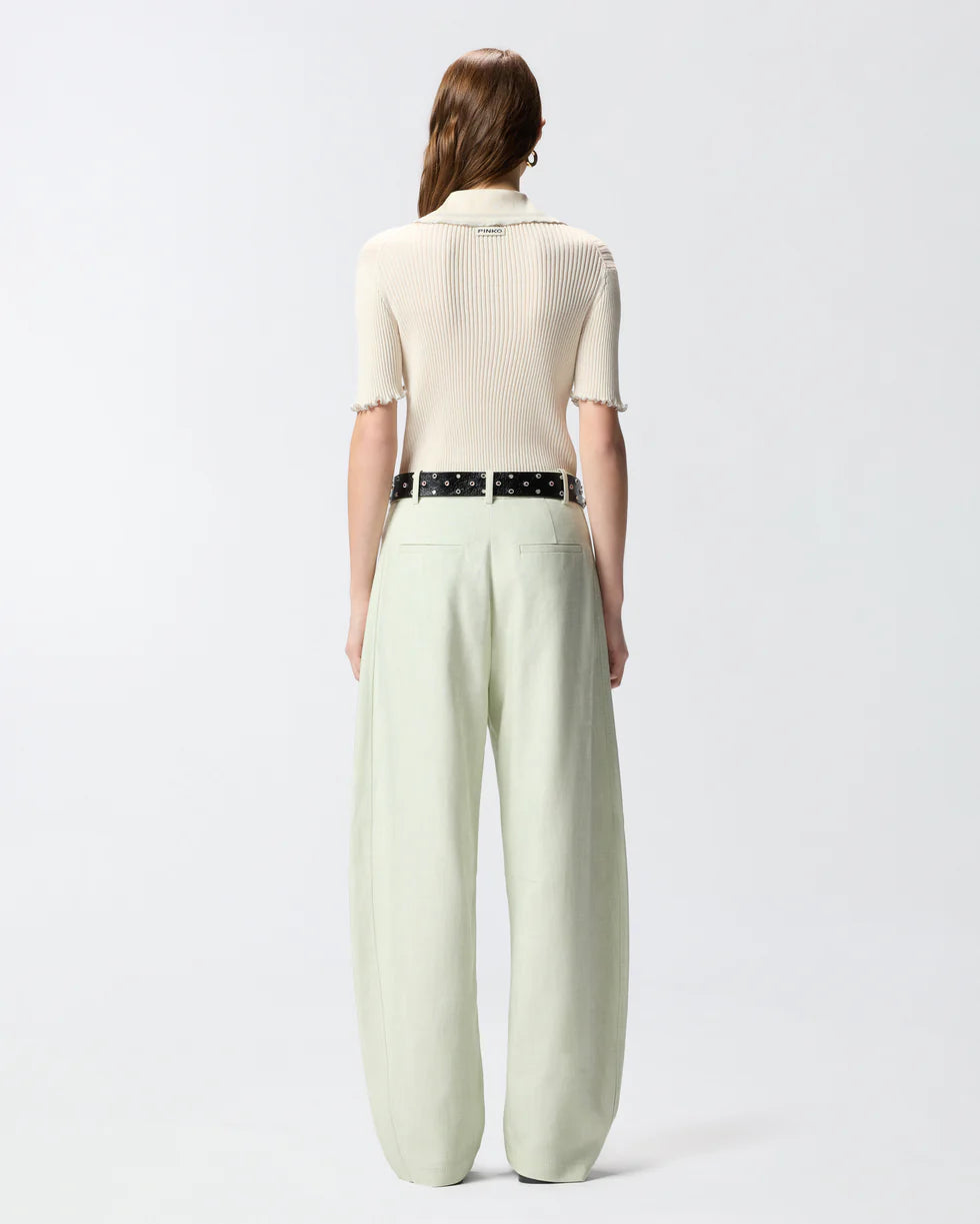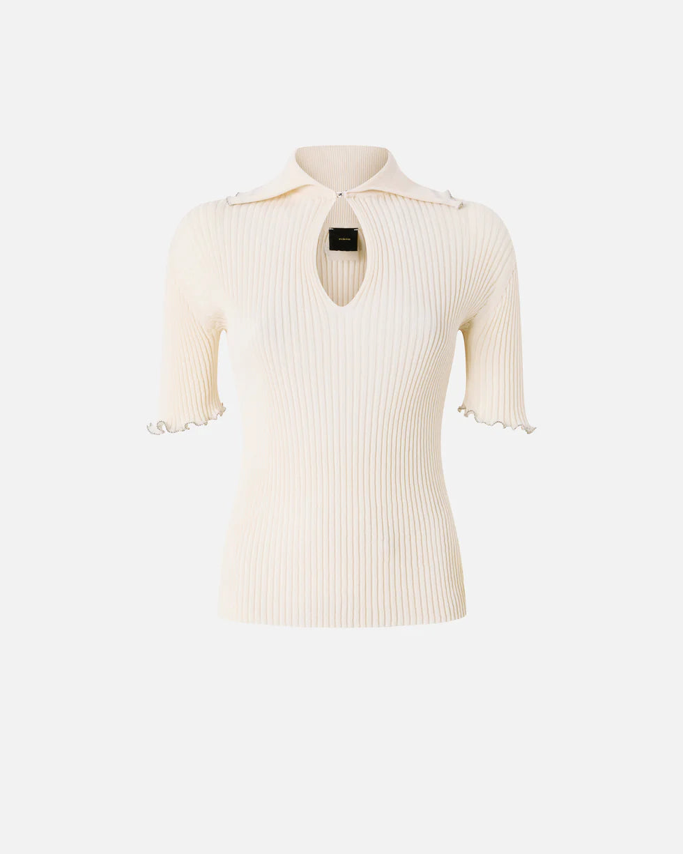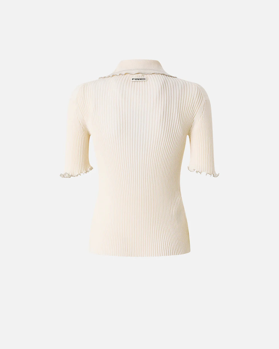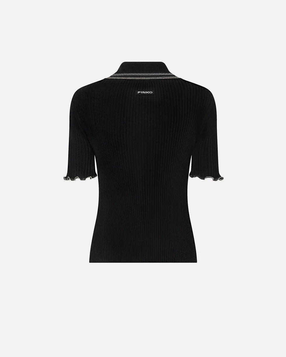 Maglia con mezze maniche e colletto a polo realizzata in crêpe di misto cotone a costine. Il modello, con scollo a goccia chiuso da un gancetto, si caratterizza per le maniche e il colletto con orlo arricciato impreziosito da piccole sfere metalliche, che creano un raffinato gioco tra l'opacità del tessuto e la luminosità del metallo. Il tocco finale è dato dall'etichetta con logo lettering PINKO sul retro. Abbina questa maglia a modelli coordinati per un total look comodo e chic per i tuoi momenti di svago.