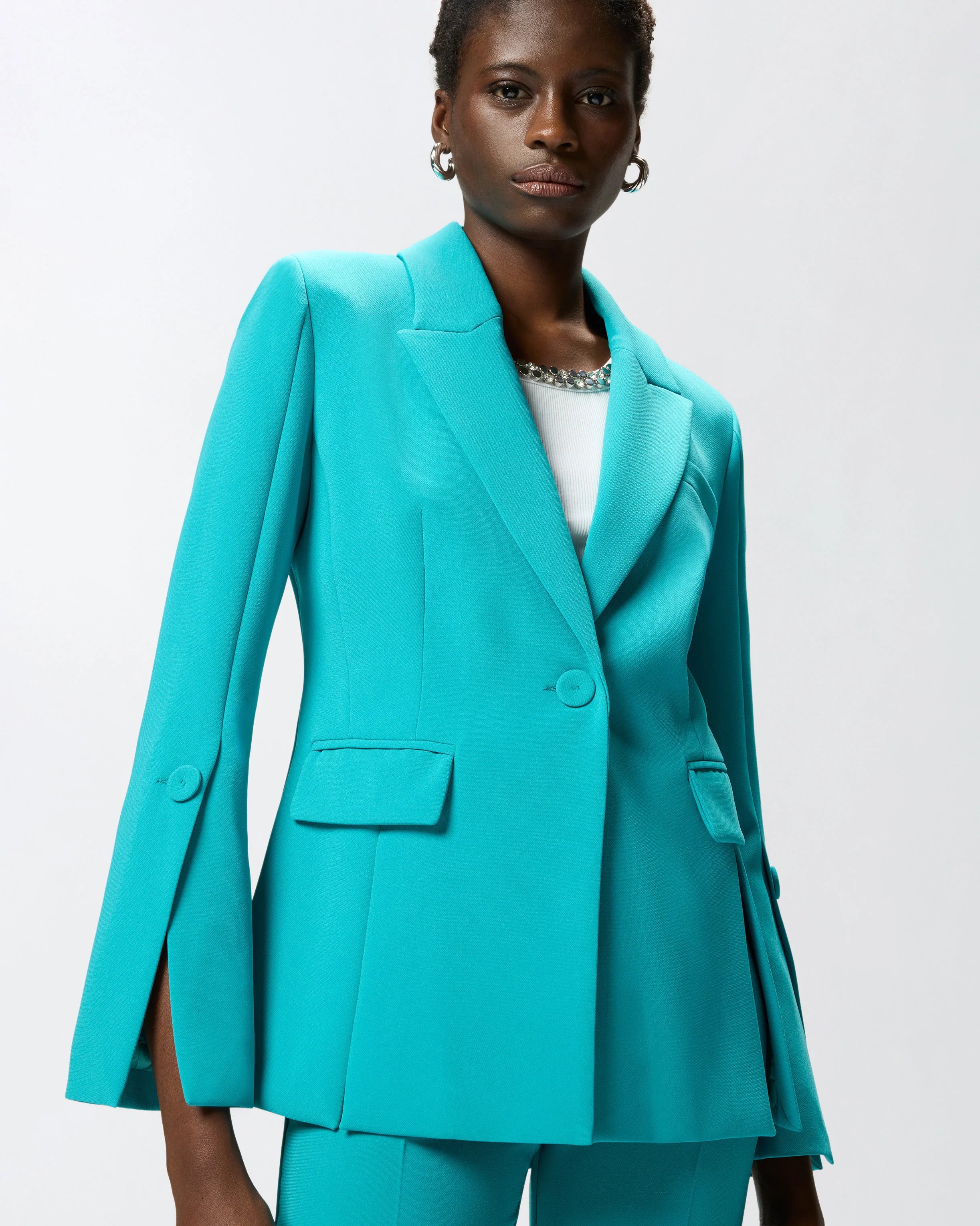 Giacca foderata in leggera georgette e realizzata in tela tecnica, un tessuto comodo e traspirante per un mix irresistibile di funzionalità ed eleganza contemporanea. Il capo, dotato di revers a lancia, due tasche frontali con patta e un taschino a filetto sul petto, non rinuncia alla preziosità, data dal bottone gioiello che caratterizza la chiusura monopetto. Il modello si distingue inoltre per i raffinati spacchi, presenti sotto le tasche, sul retro, e a fondo manica, dove sono accompagnati da un bottone rivestito. Indossa questa giacca con i pantaloni coordinati per creare un total look adatto alle occasioni formali, oppure abbinala a capi più casual per un outfit dall'animo urban-chic.