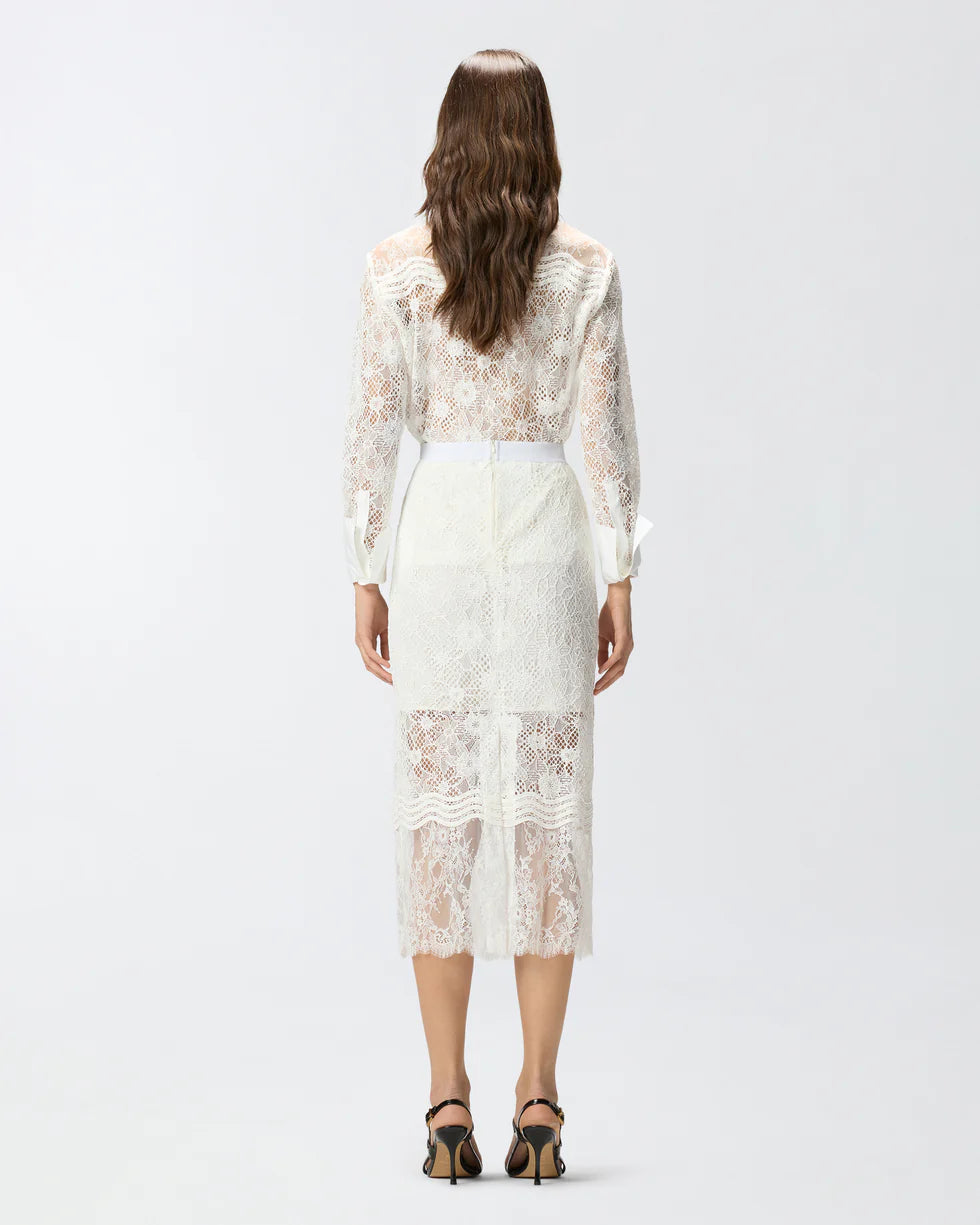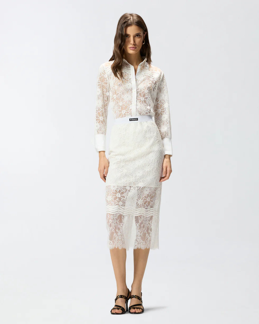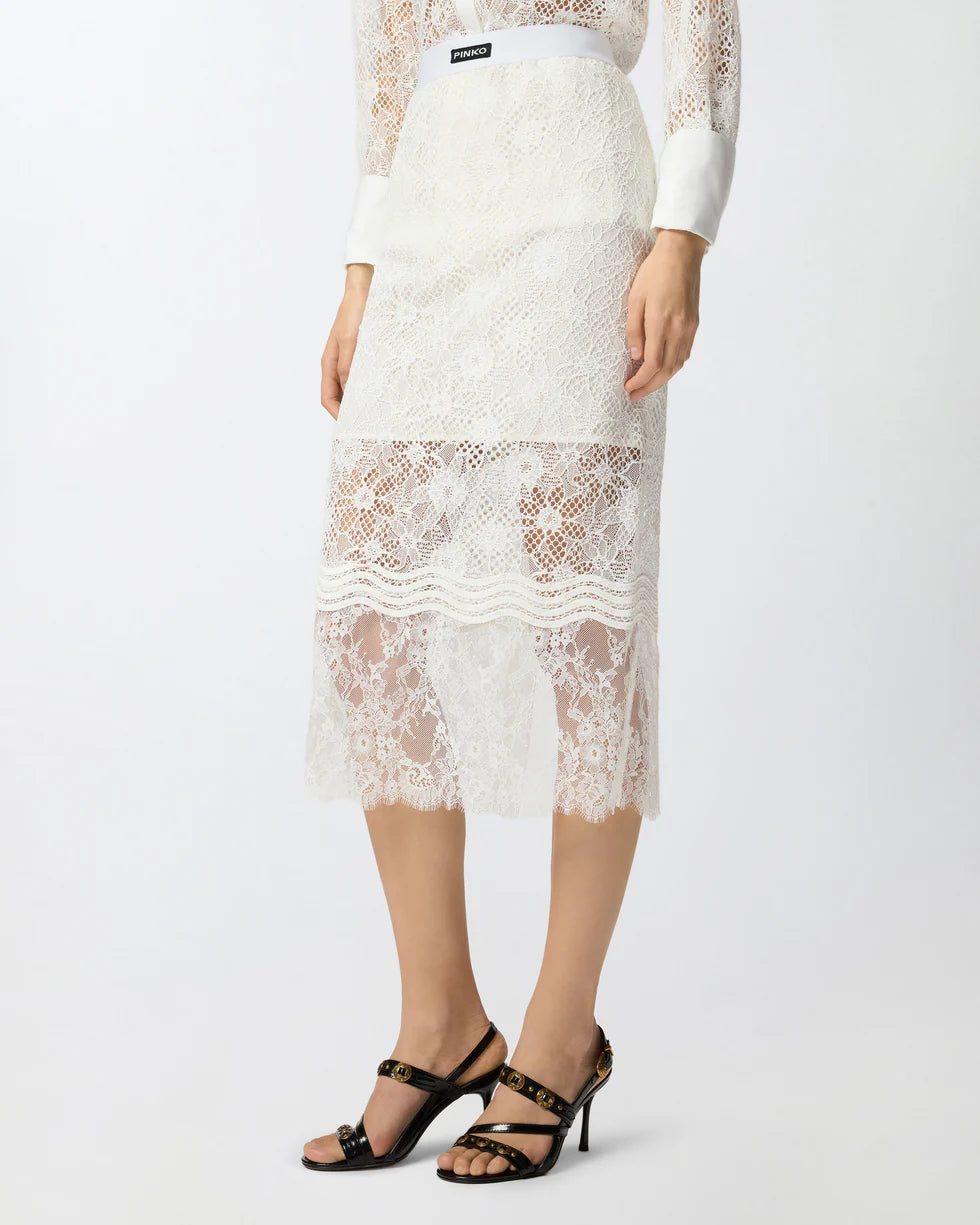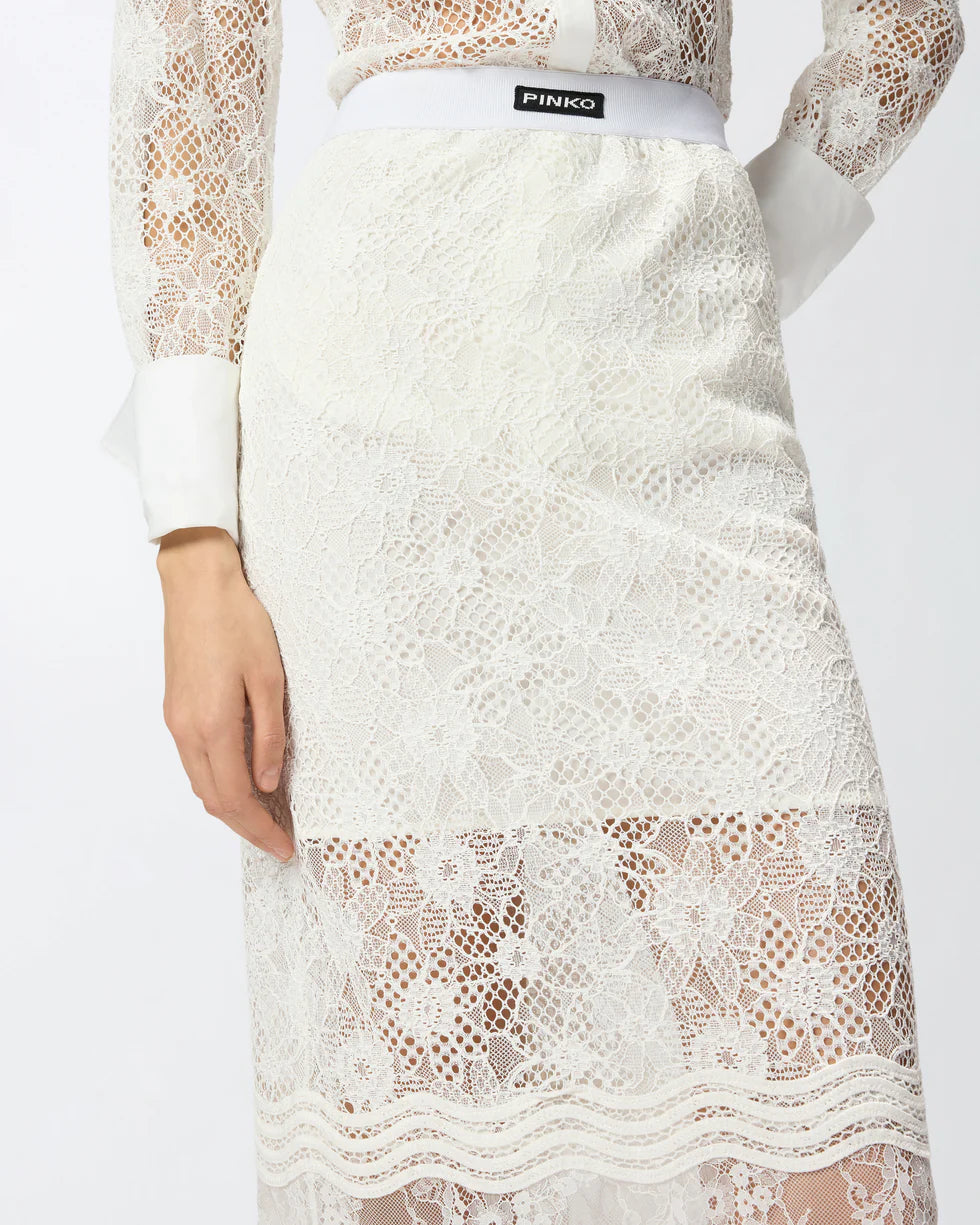 Gonna midi dalla silhouette aderente con comoda fascia in vita ed eleganti spacchetti centrali fronte e retro, personalizzata da un'etichetta con l'emblematico logo lettering PINKO sul davanti. Dotato di una chiusura posteriore con zip invisibile per facilitare l'indosso e di una fodera parziale per attenuare le trasparenze, il modello è interamente decorato da un elaborato mix di diverse tipologie di pizzo, ognuna caratterizzata da un aspetto unico: il pizzo rebrodé, utilizzato come base, si distingue per l'effetto in rilievo, il pizzo chantilly, più fine e leggero, rifinisce le bordure, e il pizzo macramè impreziosisce le applicazioni ondulate della parte inferiore. Il risultato è una gonna dall'aspetto tridimensionale e grafico che non rinuncia a un tocco di velata sensualità: indossala per look speciali o da sera con la camicia coordinata, oppure provala con un crop top colorato.
