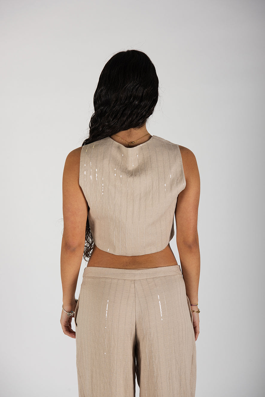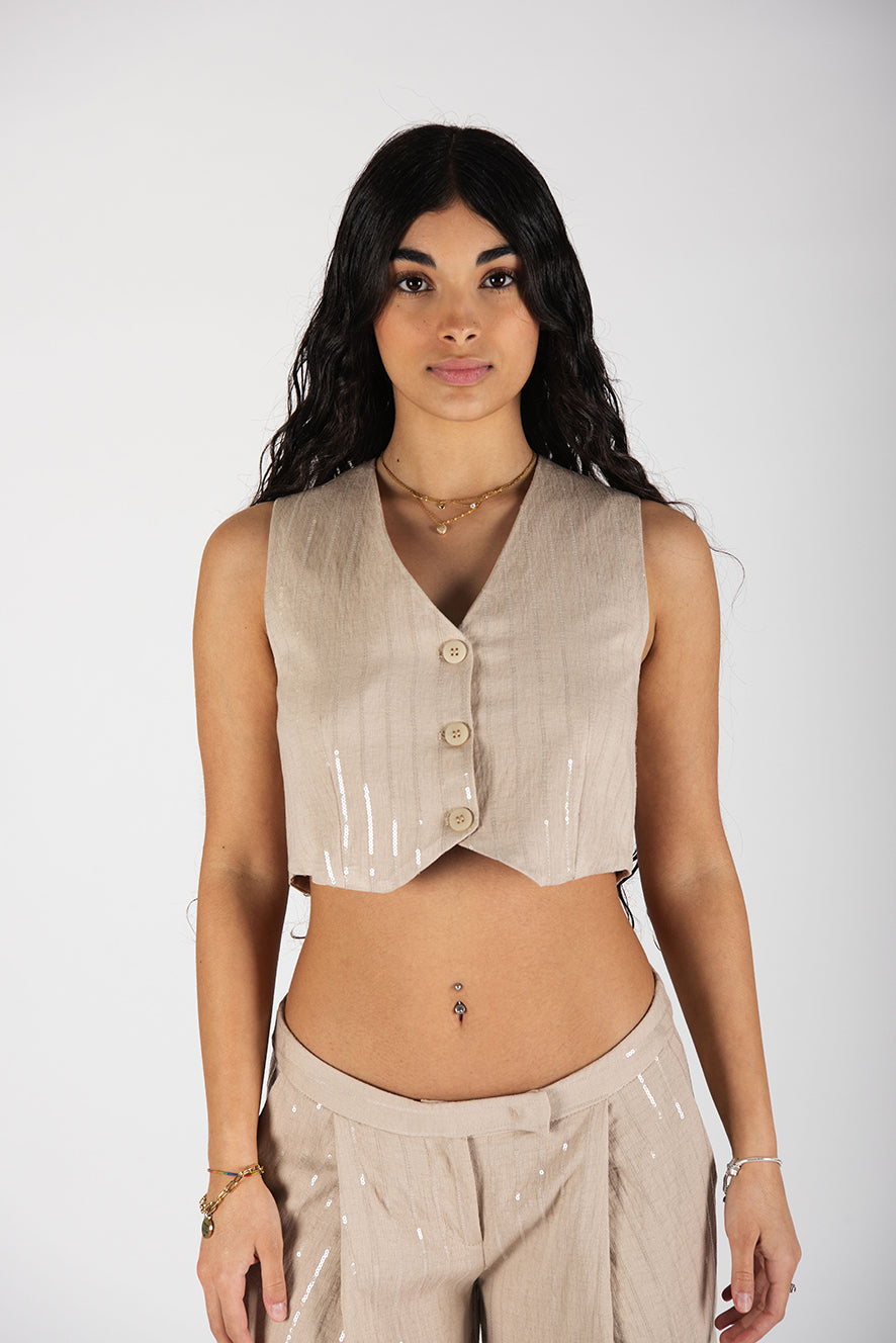 Gilet corto effetto lino. Dettaglio riga lurex tono su tono.