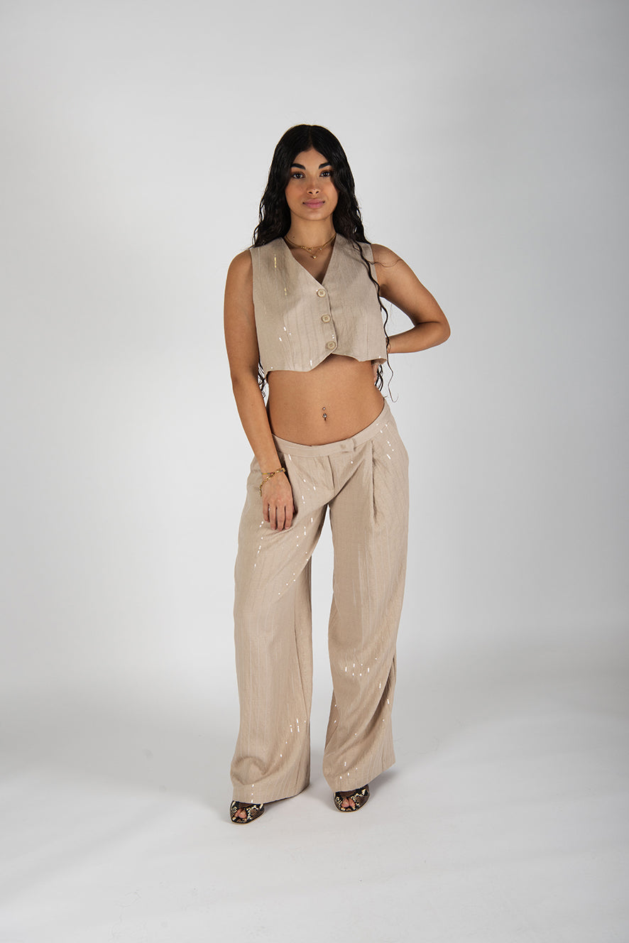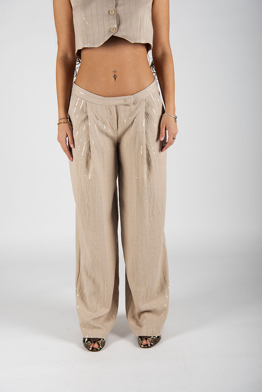Pantalone palazzo vita bassa. Pences davanti. Tasche ai lati.